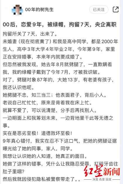 据其称,因发现相恋9年的未婚妻“劈腿”不忠,他在愤怒之下将未婚妻出轨的证据发给了双方所认识的亲人、朋友。不久,他便因“侵犯隐私”被公安机关行政拘留7天,也就此留下案底,不得不主动从所在的央企离职。