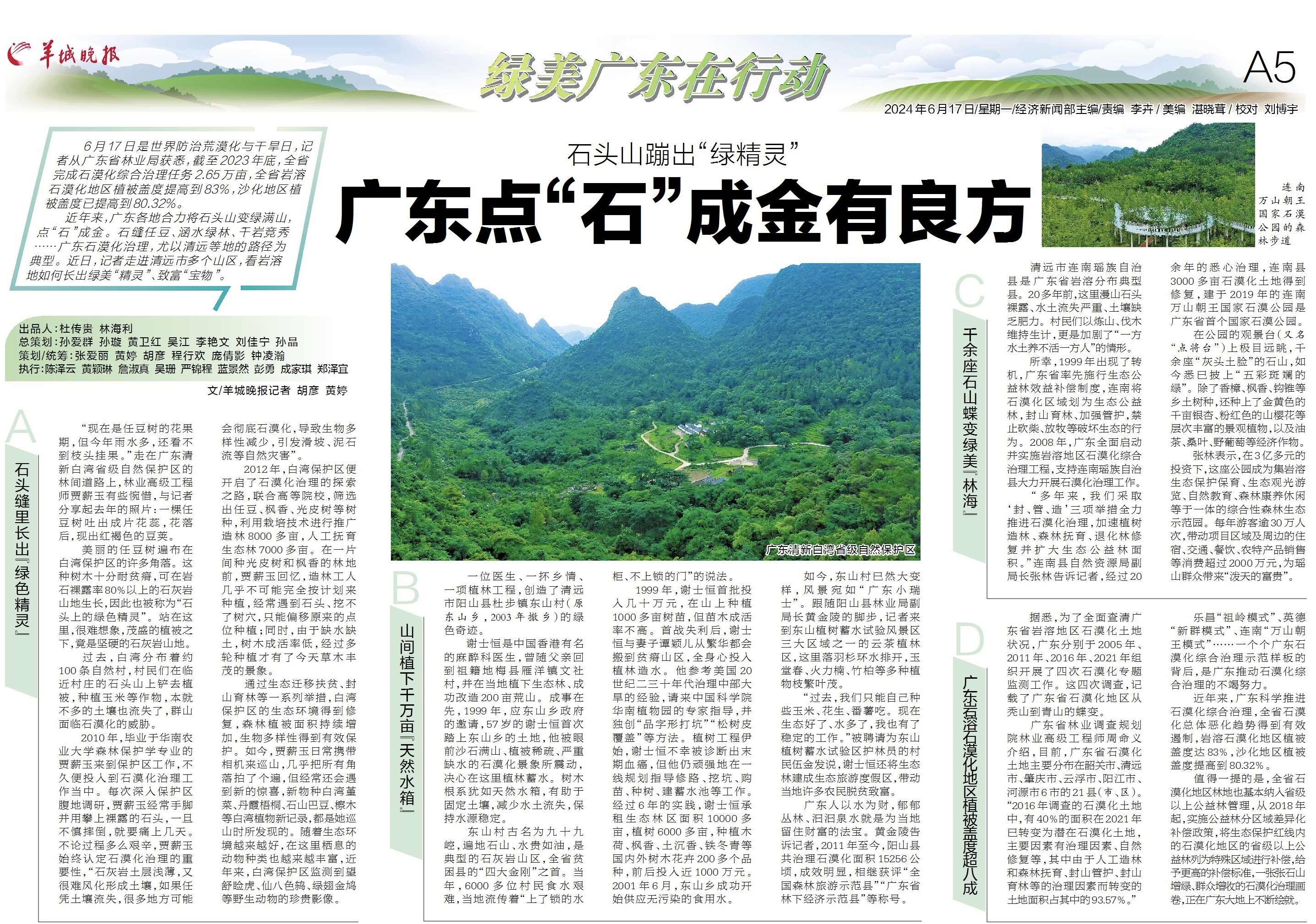 近年来,广东科学推进石漠化综合治理,全省石漠化总体恶化趋势得到有效遏制,岩溶石漠化地区植被盖度达83%,沙化地区植被盖度提高到80.32%。