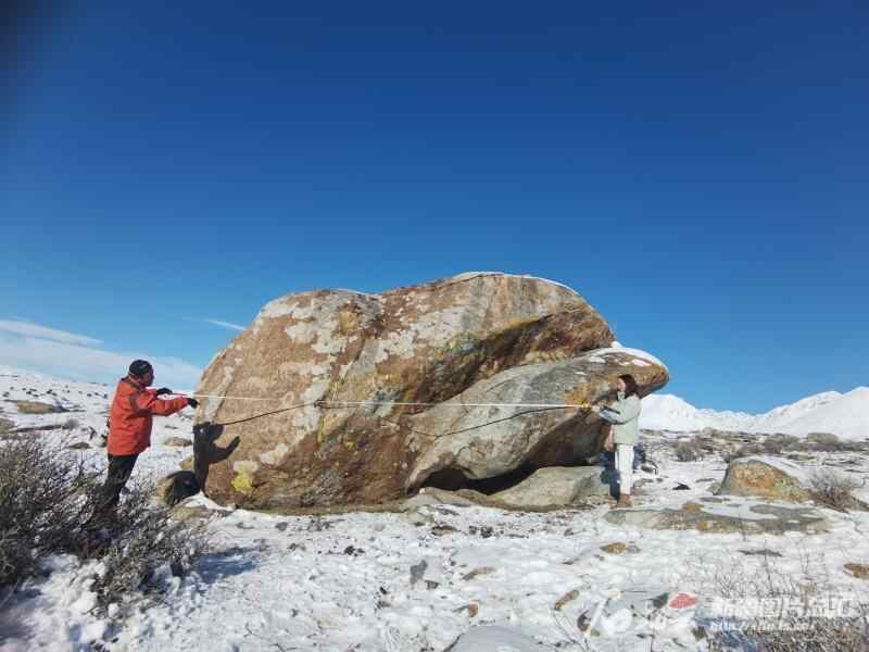10月18日,尚国军(左)和朱平(右)一起在测量岩画的体积。石榴云/新疆日报记者 白素君 摄