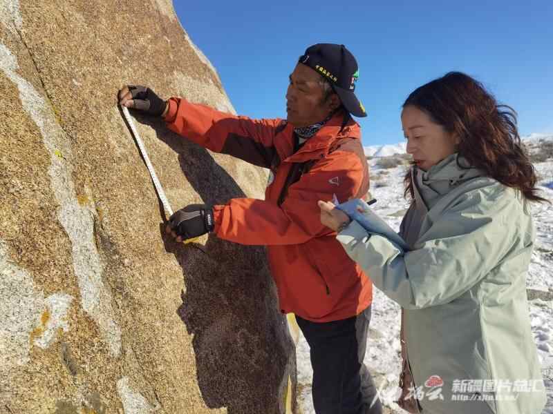 尚国军从事文物保护工作36年了,经验丰富。他们先巡查了岩画群、墓葬群、遗址群的保护标志牌和周围防护栏等设施情况,一切正常。接着,两人开始对东、南、西、北四个方向的重点岩画巡查、记录。尚国军先拭去岩画上的雪花,然后用设备进行测量、定位和拍照,朱平负责现场记录。最后,两人仔细观察了苔藓、风雪对岩画表面造成腐蚀的情况。