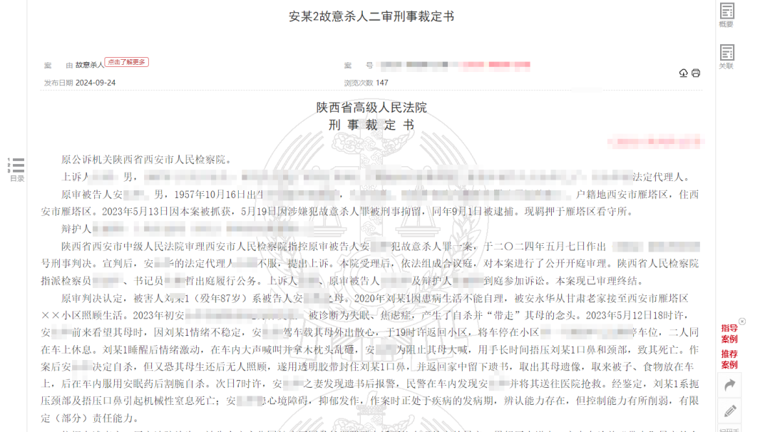 2023年5月,西安的安某开车带着87岁的母亲外出散心。因患有老年痴呆症的母亲车内大喊,他长时间捂压母亲口鼻致其死亡。