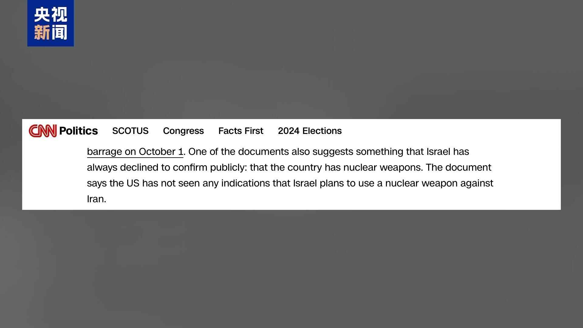 文件还提到,美国没有看到以色列计划使用核武器的迹象。美国有线电视新闻网报道称,这暗示以色列实际上拥有核武器。