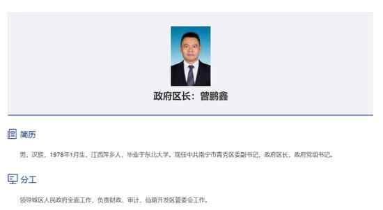 公开信息显示,曾鹏鑫,1978年1月生,江西萍乡人,毕业于东北大学。现任中共南宁市青秀区委副书记,政府区长,政府党组书记。领导城区人民政府全面工作,负责财政、审计、仙葫开发区管委会工作。