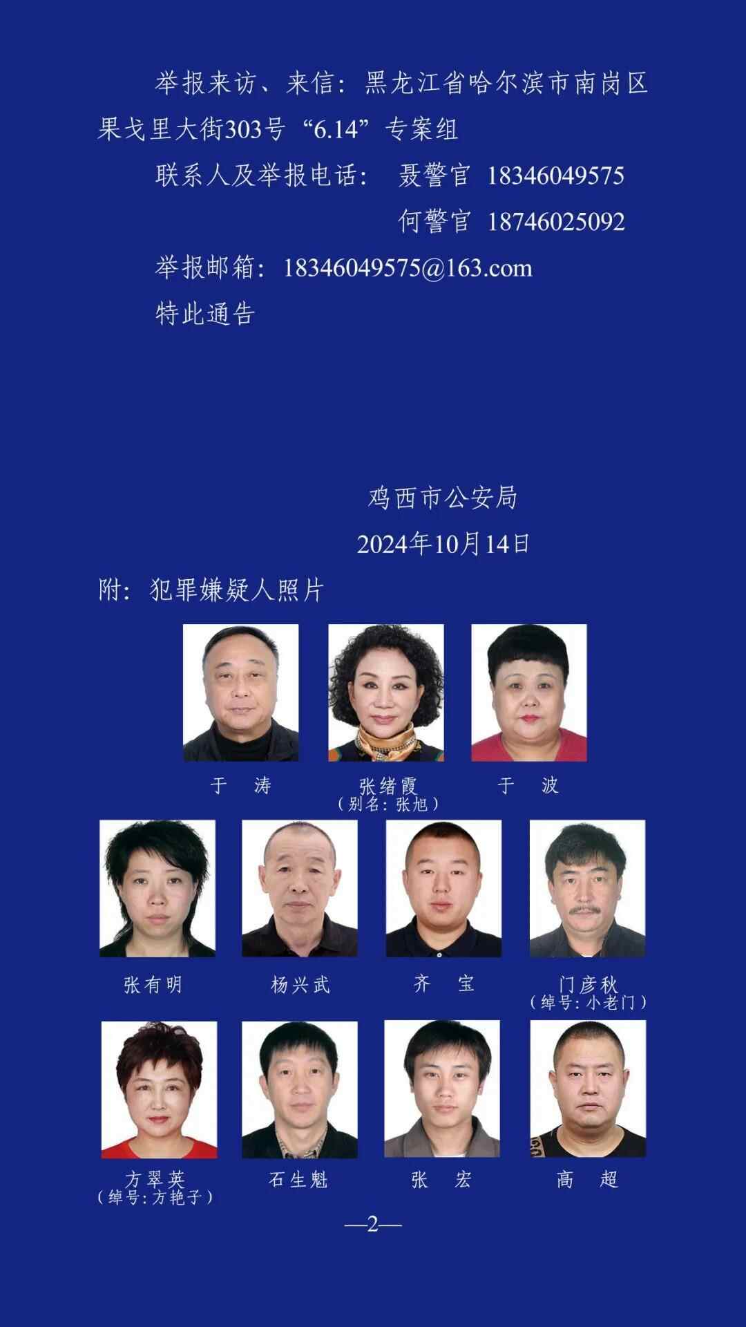近日,黑龙江省鸡西市警方发布“关于公开征集哈尔滨市于涛、张绪霞、于波等人涉嫌黑恶违法犯罪线索的通告”。