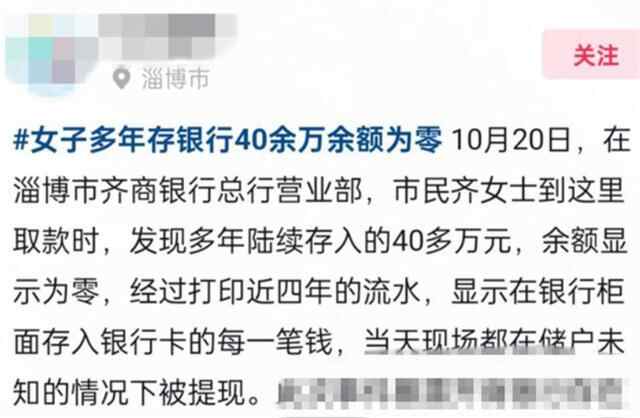 近日,有网友发文称,山东淄博一女子多年来在齐商银行存款40多万元,取款时余额却为零。10月22日,齐商银行客服回应记者称,此事已向相关业务部门反馈,目前没有相应处理结果。国家金融监督管理总局淄博监管分局工作人员表示,此事该局已关注跟进。
