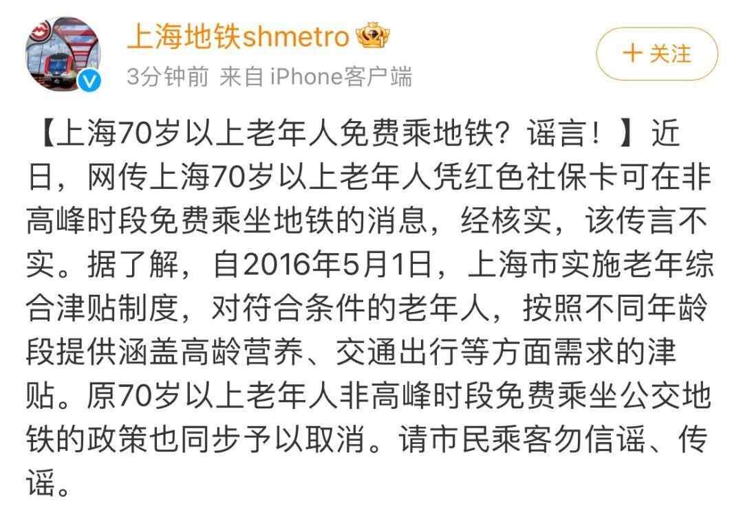 “据了解,自2016年5月1日,上海市实施老年综合津贴制度,对符合条件的老年人,按照不同年龄段提供涵盖高龄营养、交通出行等方面需求的津贴。原70岁以上老年人非高峰时段免费乘坐公交地铁的政策也同步予以取消。请市民乘客勿信谣、传谣。”
