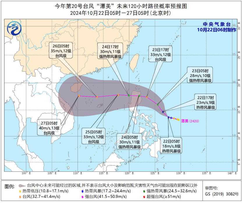 中央气象台预计,“潭美”将以每小时10—15公里的速度向西北方向移动,强度逐渐增强,逐渐向菲律宾吕宋岛东部沿海靠近。受南下冷空气和“潭美”的共同影响,未来5天,巴士海峡、台湾以东洋面、台湾海峡、南海大部、北部湾、琼州海峡、台湾沿海、华南沿海将出现一次较强的大风天气过程,过往船只需注意航行安全。