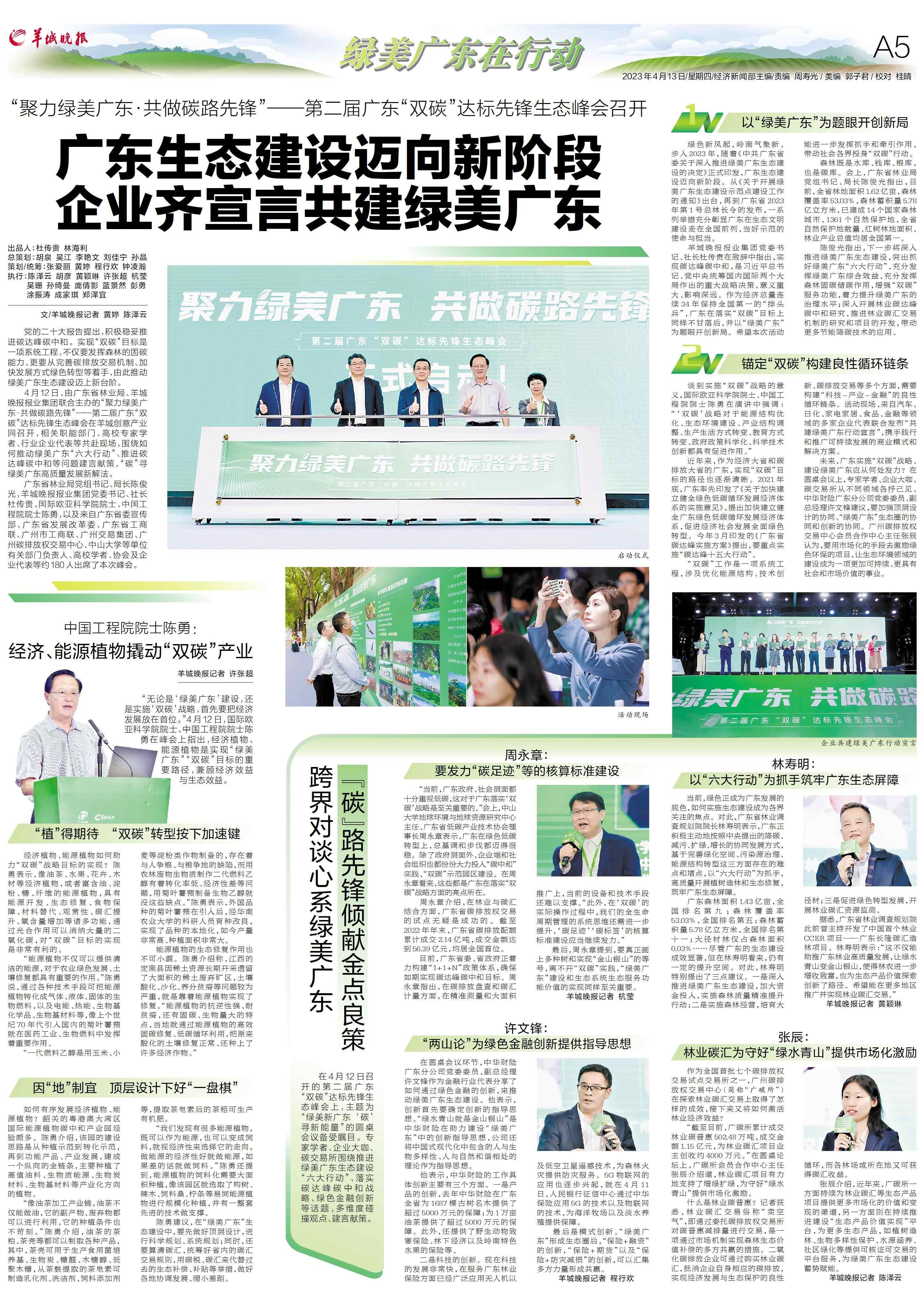 4月12日,由广东省林业局、羊城晚报报业集团联合主办的“聚力绿美广东·共做碳路先锋”——第二届广东“双碳”达标先锋生态峰会在羊城创意产业园召开,相关职能部门、高校专家学者、行业企业代表等共赴现场,围绕如何推动绿美广东“六大行动”、推进碳达峰碳中和等问题建言献策,“碳”寻绿美广东高质量发展新解法。
