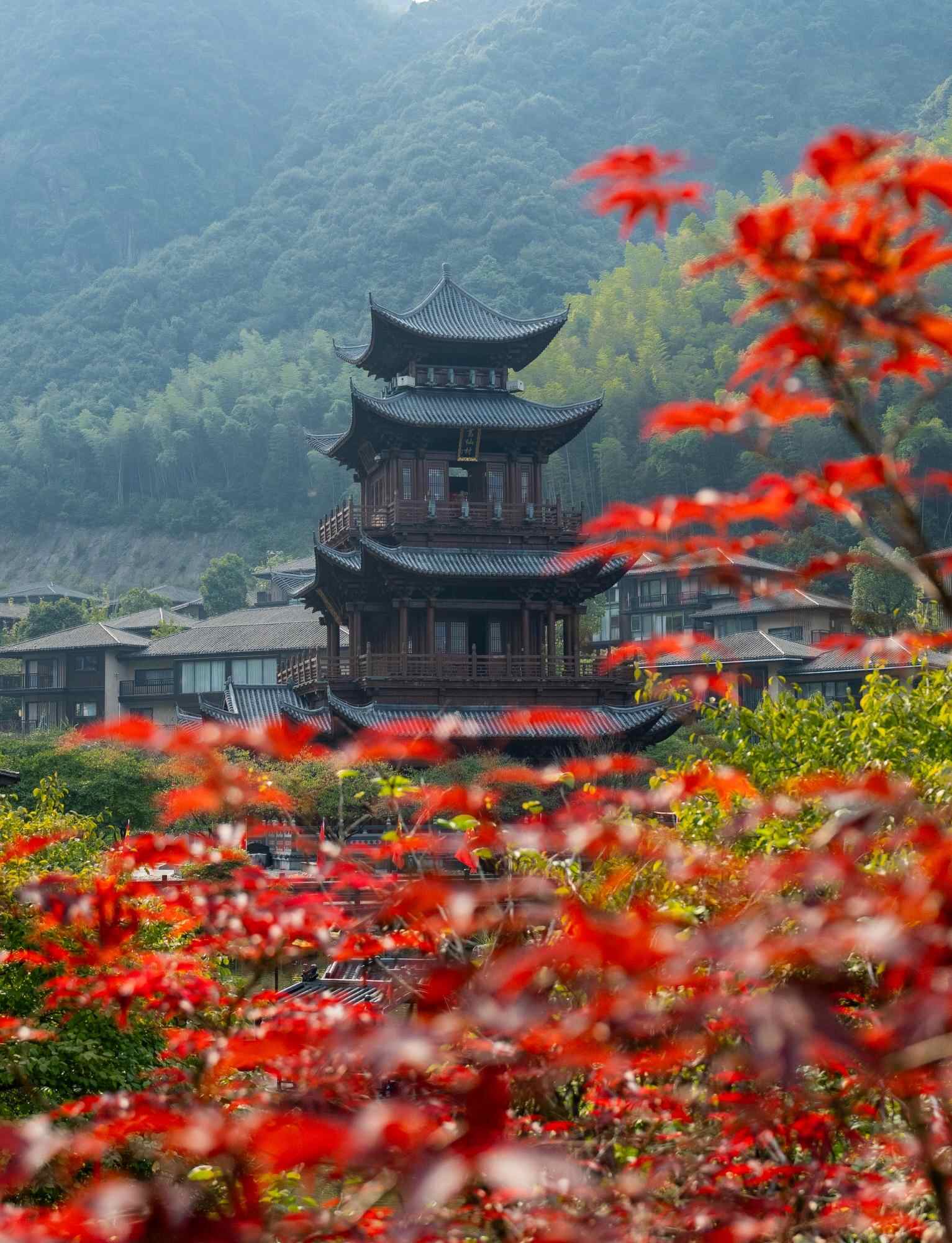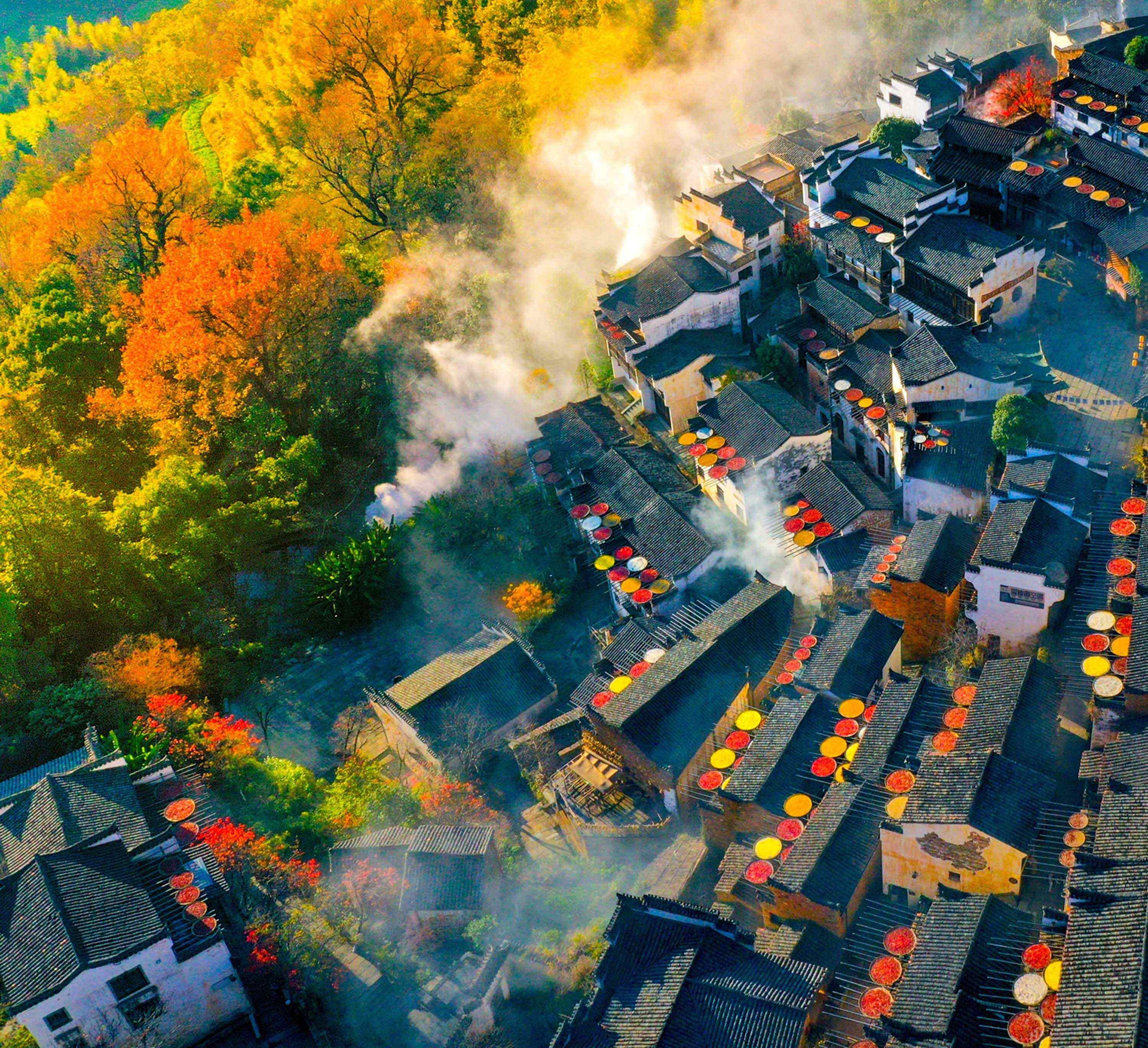 上饶葛仙山下,葛仙村的红枫在云雾缭绕中探头,与高低错落的古朴屋舍相映成趣,画出一幅“秋日仙村图”。