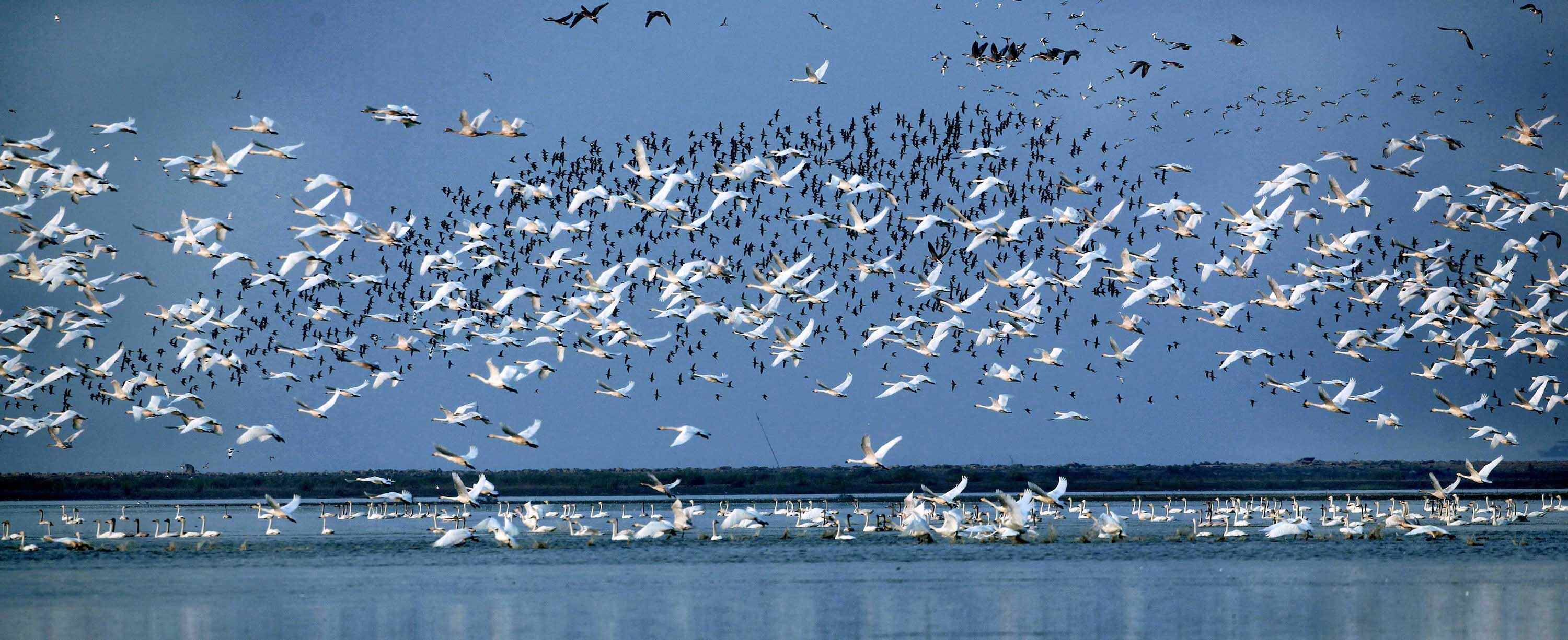 水绕过群山,退入长江,此时的鄱阳湖露出洲滩和蝶形湖,迎接成群迁徙的候鸟。草茂鱼肥,雁鸣鹤舞,70多万候鸟将在这里度过严冬。