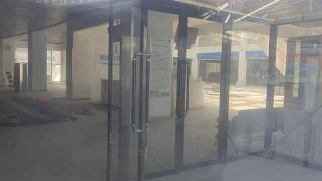 客运枢纽站主体综合楼的大门紧闭,北侧一楼大厅门廊上立有“沙客越野综合体”字样。大厅里有两位工人正在施工,客运枢纽站前广场空地上堆有一些建筑材料。