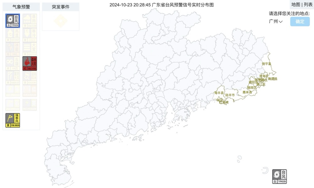 截至10月23日20时28分广东台风预警信号发布情况。广东气象网截图