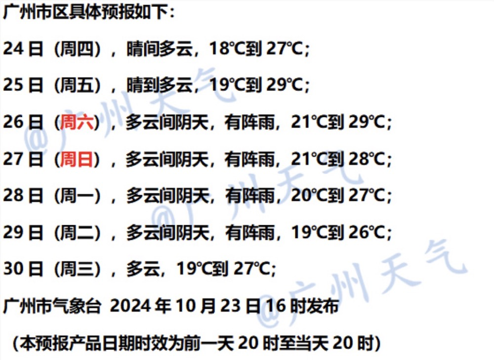 广州市气象台10月23日市区七天预报。图/@广州天气