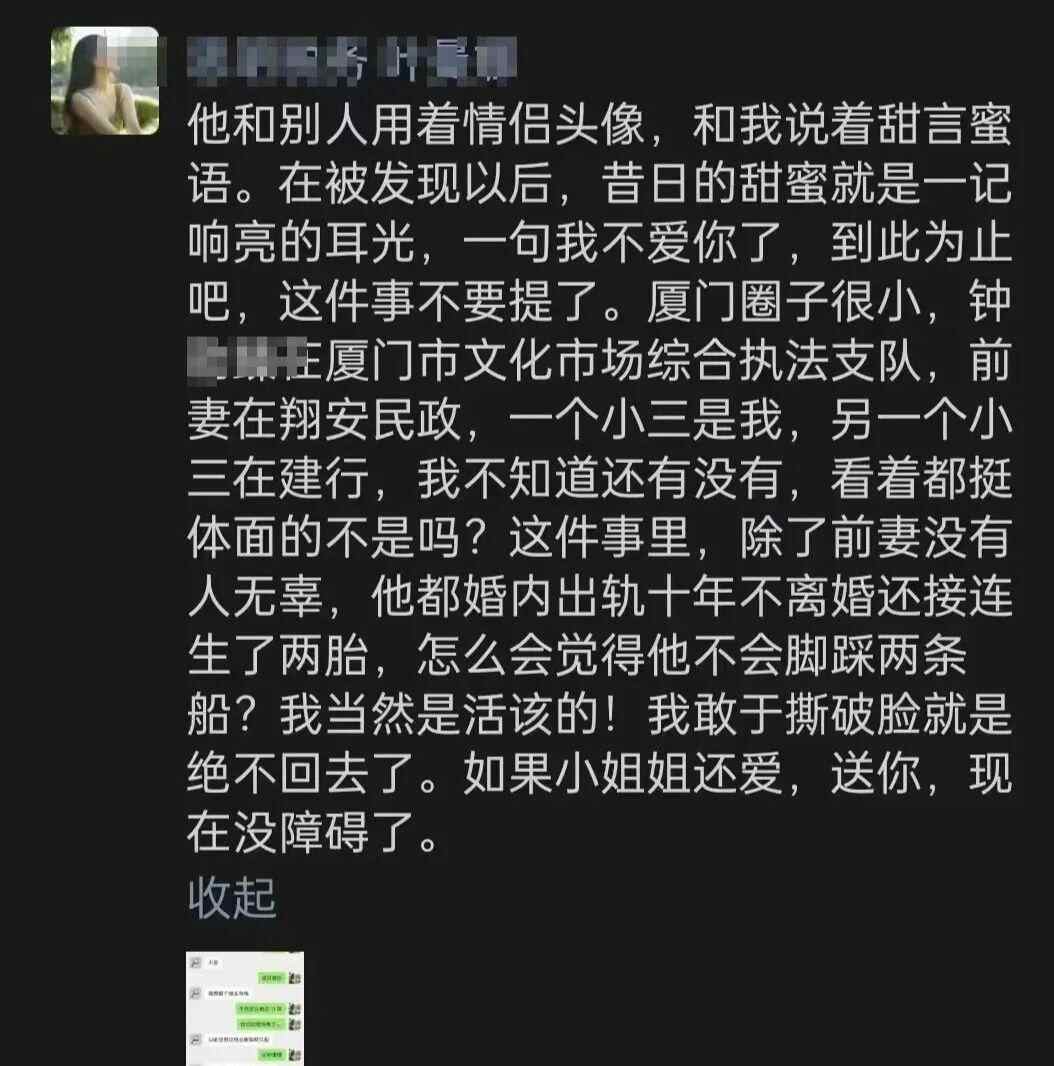 近日,网传一女子在朋友圈自称系厦门文化市场综合执法支队一干部的“第四者”,引发关注。