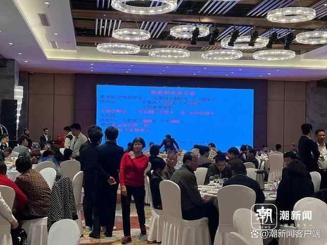 酒会办在了杭州萧山某豪华酒店,一个大厅里摆上了十多张圆桌,来参会的大多是上了年纪的老人,主席台的屏幕上放着旅游购房的简单介绍,“豪华航空背椅原价:夫妻两人500元、个人500元;活动价:夫妻两人200元、个人200元,下周恢复原价。并额外增收价值88元海蜇头一箱,仅限前15名。”
