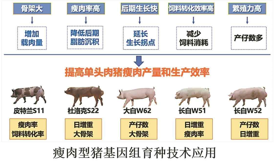 此外,基因组育种技术在瘦肉型猪本土化选育中应用,加快了种猪遗传改良进展,培育种猪新品种。构建了瘦肉型猪基因组选择参考群体9.5万头,建立了基因组育种技术标准化操作流程和开放共享平台,应用于12个瘦肉型猪专门化品系的本土化选育,实现了断奶前的早期选择。