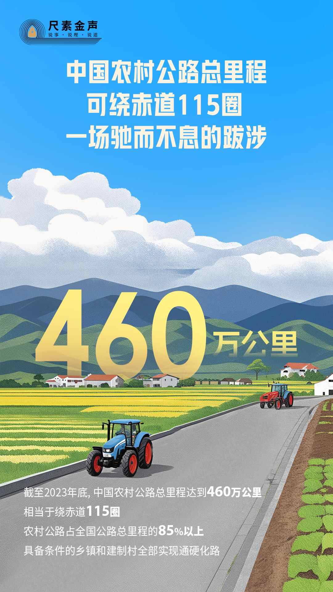 截至去年底,中国农村公路总里程达到460万公里,相当于绕赤道115圈;农村公路占全国公路总里程的85%以上,具备条件的乡镇和建制村全部实现通硬化路。