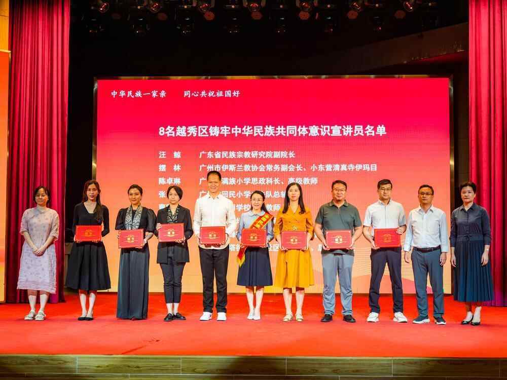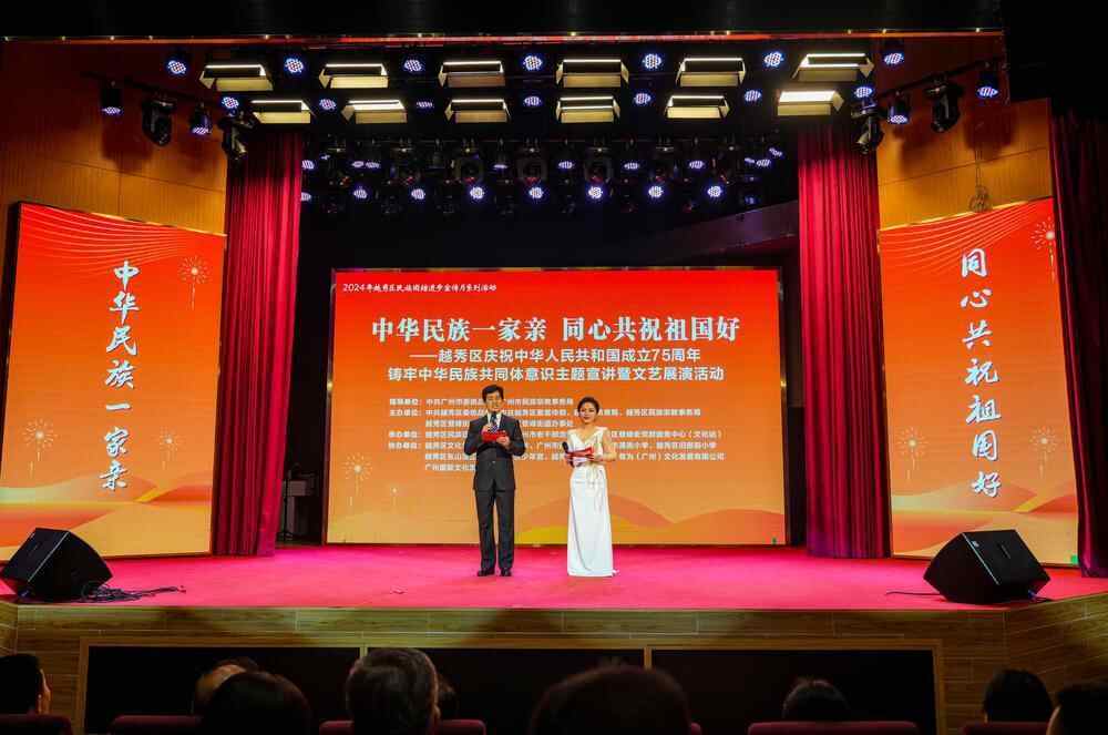 活动现场为越秀区登峰街宝汉社区居委会荣获“全国民族团结进步模范集体”揭牌;市、区领导为越秀区铸牢中华民族共同体意识宣讲员颁发聘书。越秀区民族宗教事务局负责人致辞时强调,这场活动不仅是对祖国辉煌成就的庆祝,也是对越秀区深化民族团结进步宣传教育活动和创建铸牢中华民族共同体意识示范街区工作的成果展示,今后越秀区的工作要紧扣铸牢中华民族共同体意识工作主线,聚焦对伟大祖国、中华民族、中华文化、中国共产党、中国特色社会主义“五个认同”,深化铸牢中华民族共同体意识宣传教育实践,深入持久地在全区各机关、社区、学校、宗教活动场所和企业单位开展民族团结进步创建活动,积极培育中华民族共有精神家园,促进各民族交往交流交融,积极构建互嵌式社会结构和社区环境,创建更多的具有越秀特色的城市民族工作品牌,引领带动新时代越秀区民族工作全面出新出彩。