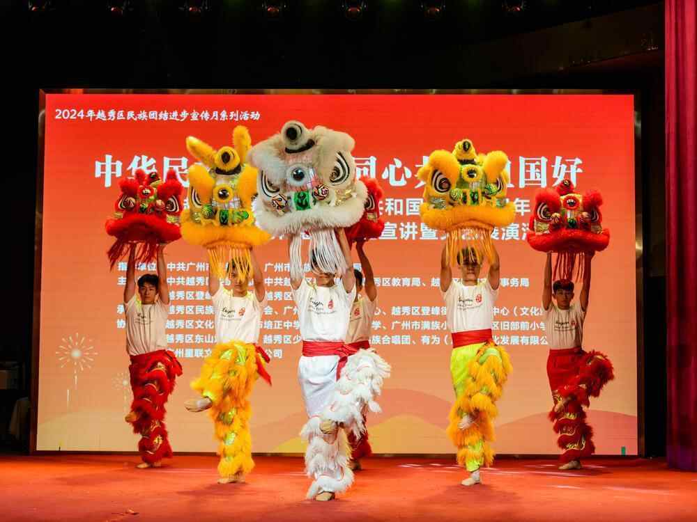 文艺展演活动内容丰富精彩,越秀区文化馆、广州市培正中学、广州市回民小学、广州市满族小学、广州培正中学、越秀区东山培正小学、越秀区少年宫、越秀区民族合唱团和华南师范大学岭南舞蹈团安排了10组极具民族特色和时代特色的节目,包括绚丽多彩的开场舞《狮舞岭南》、民族服装秀、少儿舞蹈《曙光》、独唱《我和我的祖国》、少儿武术《武动少年》、合唱《理想之光》、顶碗舞《心中的祝福》、舞蹈《喜鼓飞扬满韵情》、民族舞蹈《汪嘟》和全场大合唱《我的祖国》《歌唱祖国》等,各族群众用精彩的表演表达了对祖国的热爱和对民族团结的祝福,展现了各族儿女在党的领导下同心共筑中国梦的精神风貌。