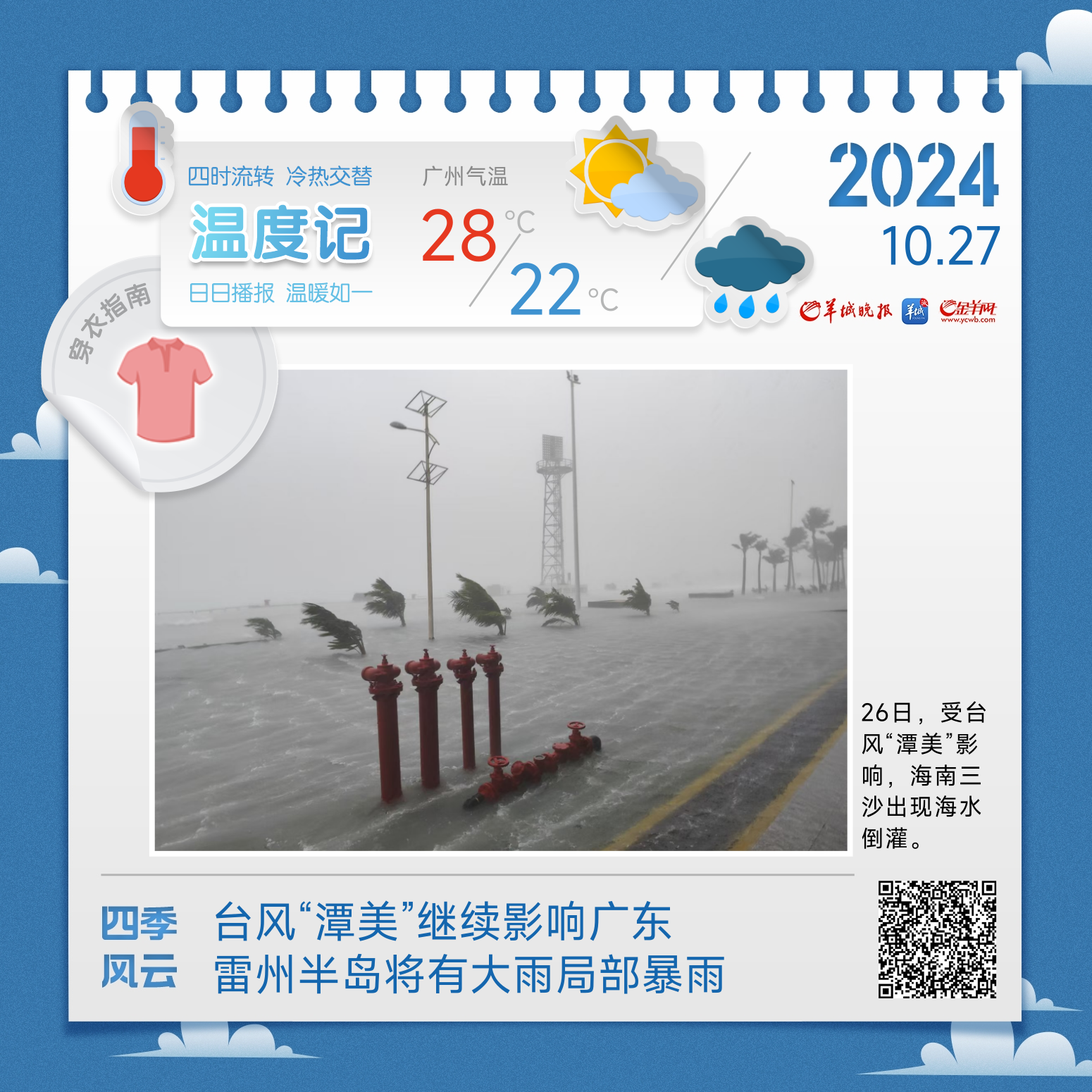 @广东天气 预计,27-29日广东云量增多,部分市县有阵雨,粤西局部雨势大。受冷空气和台风“潭美”的共同影响, 27日,广东中西部海面、南海中北部海面风力大;广东陆地有5~7级阵风。
