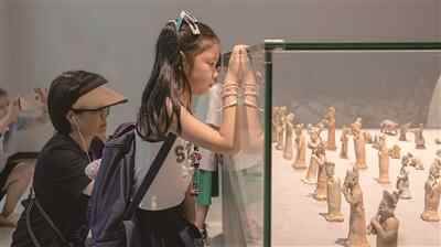 行进在博物馆中,不时遇见研学体验的师生。在老师带领下,景德镇昌江区中心幼儿园的学生围在展柜旁,认真聆听讲解员的介绍。