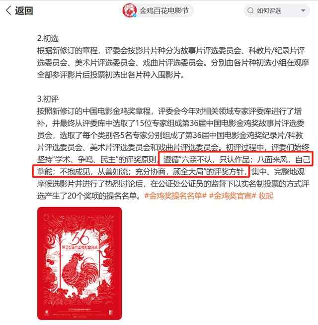 此前,金鸡百花电影节曾公布评选规则。尤其提到:评奖原则是坚持“学术、争鸣、民主”;评奖方针是遵循“六亲不认,只认作品;八面来风,自己掌舵;不抱成见,从善如流;充分协商,顾全大局”。