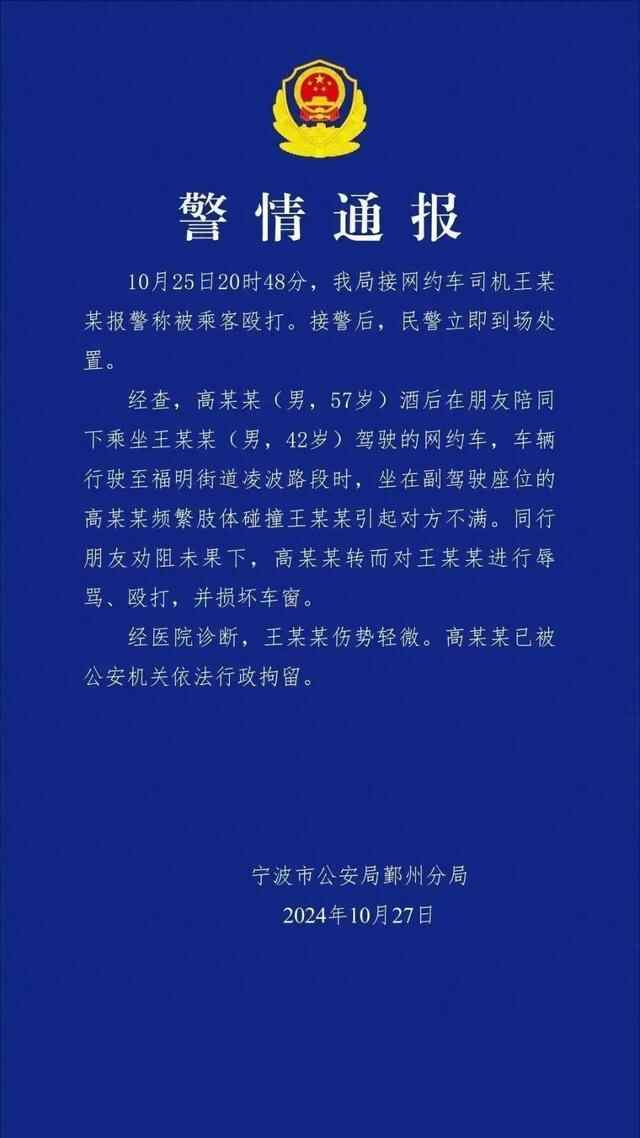 10月27日,宁波市公安局鄞州分局就该事件发布情况通报,称打人者高某某已被公安机关依法行政拘留。通报如下↓