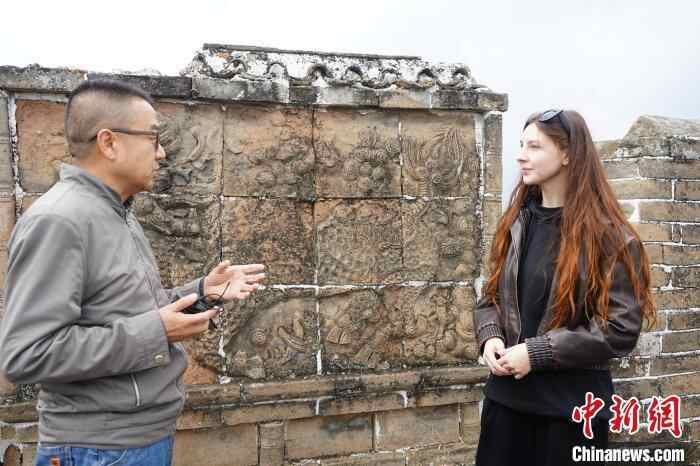 10月16日,乌克兰留学生娜斯佳观看金山岭长城上的“文字砖”。梁志青 摄