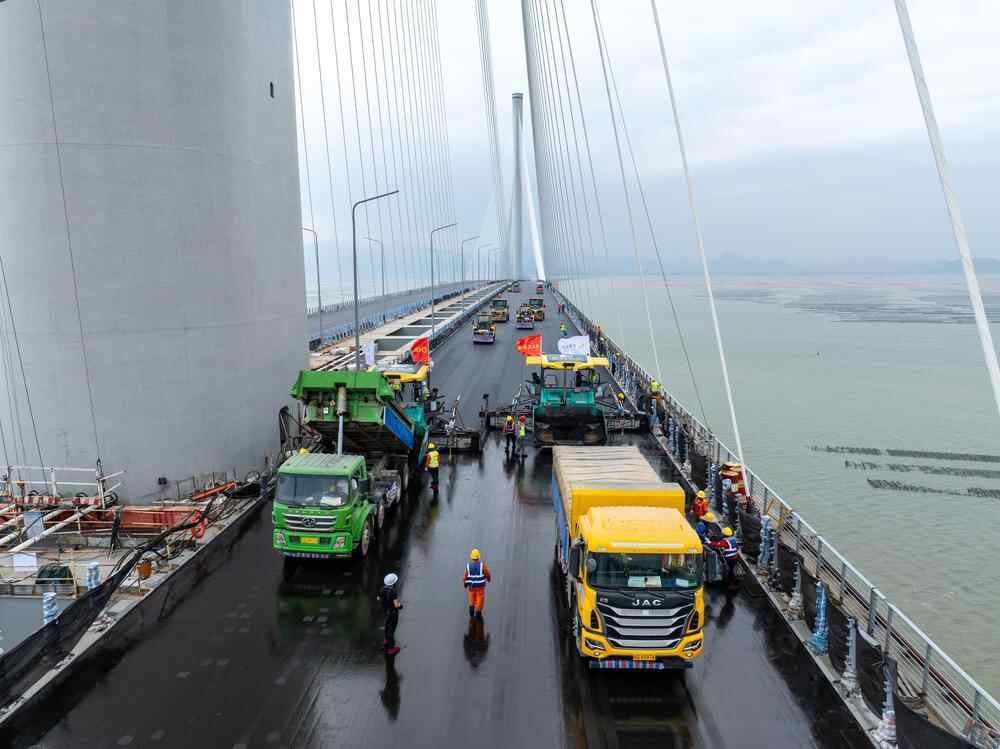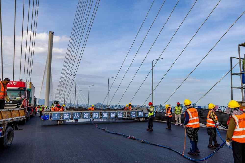 黄茅海跨海通道项目路线全长约31公里,其中海域段长度约14公里,设置高栏港大桥和黄茅海大桥2座主桥,钢桥面铺装体量16.4万平方米。此次黄茅海大桥钢桥面施工,单次铺装面积达26350平方米,长度为1700米,单次铺装面积和单次铺装最大里程数双创世界纪录。