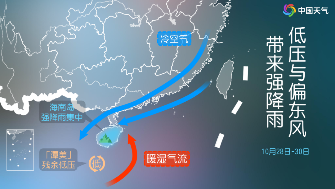 第二,在“潭美”残留低涡东北象限有偏东风持续水汽输送,叠加北部冷空气共同影响,导致海南岛上空不断触发对流并持续影响。