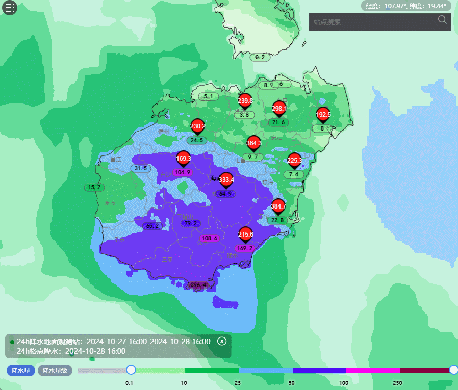 影响时间上来看,26日夜间开始持续到现在,海南岛暴雨、大暴雨差不多连下三天。其中三亚周边地区27日22时前后开始有强降雨,昨天为最强时段,目前相对有所减弱,海南岛东部和北部则是28日14时前后陆续开始的,今天仍是最强时段。