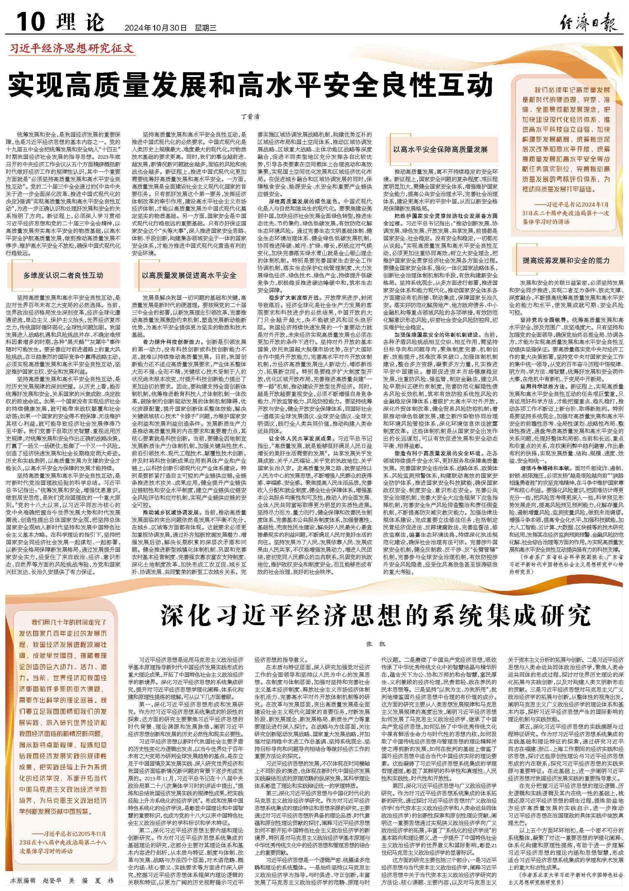 统筹发展和安全,是我国经济发展的重要保障,也是习近平经济思想的基本内容之一。党的十九届五中全会把统筹发展和安全纳入“十四五”时期我国经济社会发展的指导思想。2023年底召开的中央经济工作会议从五个方面精辟概括新时代做好经济工作的规律性认识,其中一个重要方面就是“必须坚持高质量发展和高水平安全良性互动”。党的二十届三中全会通过的《中共中央关于进一步全面深化改革、推进中国式现代化的决定》强调“实现高质量发展和高水平安全良性互动”,为进一步正确认识和处理好发展和安全的关系指明了方向。新征程上,必须深入学习贯彻习近平经济思想和党的二十届三中全会精神,以高质量发展夯实高水平安全的物质基础,以高水平安全护航高质量发展,做到推动高质量发展不停步、维护高水平安全不放松,确保中国式现代化行稳致远。