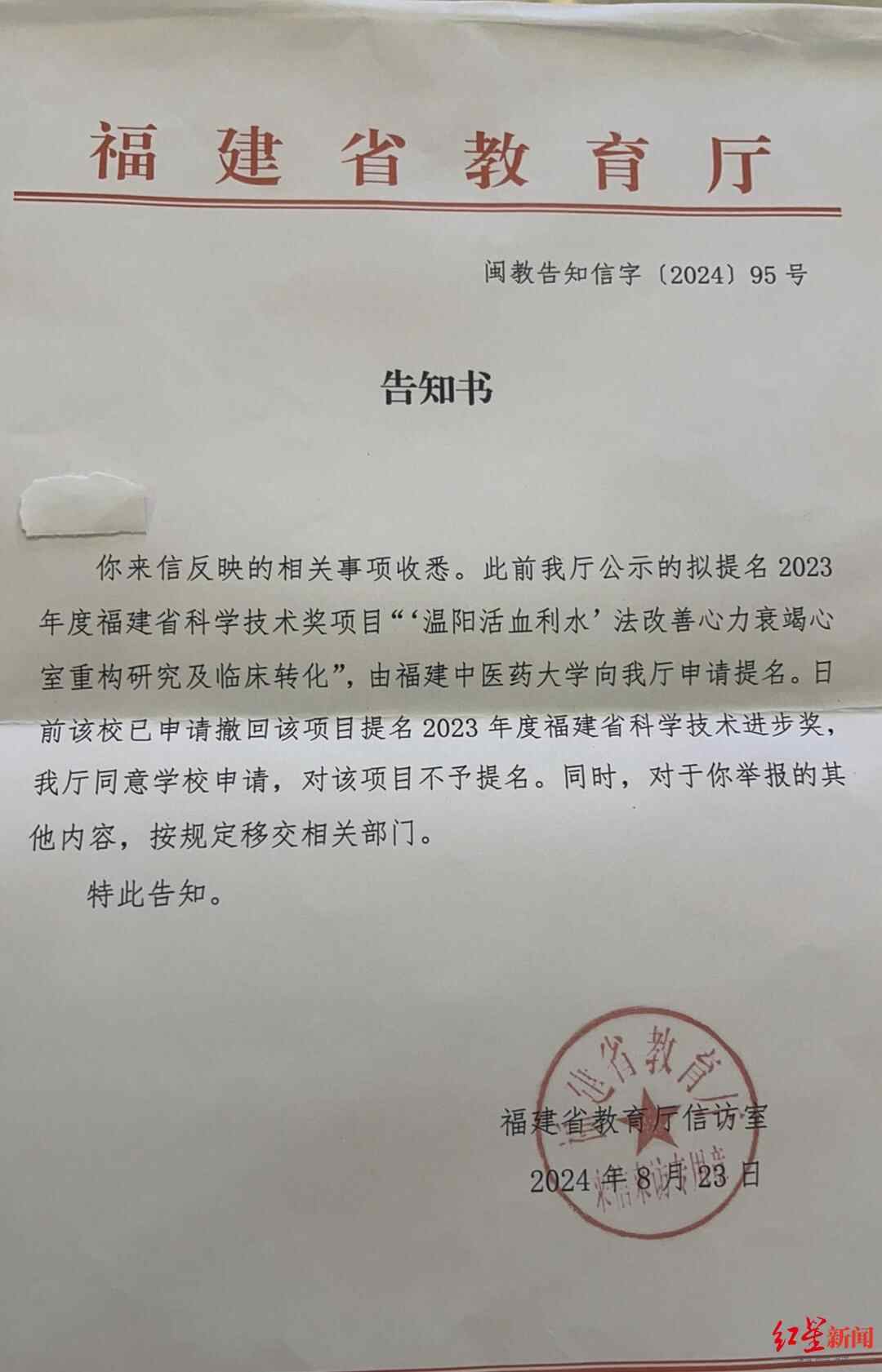 该医生提供的一份福建省教育厅回复告知书称,“你来信反映的相关事项收悉。此前我厅公示的拟提名2023年度福建省科学技术奖项目‘温阳活血利水’法改善心力衰竭心室重构研究及临床转化,由福建中医药大学向我厅申请提名。日前该校已申请撤回该项目提名2023年度福建省科学技术进步奖。我厅同意学校申请,对该项目不予提名。同时,对于你举报的其他内容,按规定移交相关部门。”该告知书落款时间为2024年8月23日。