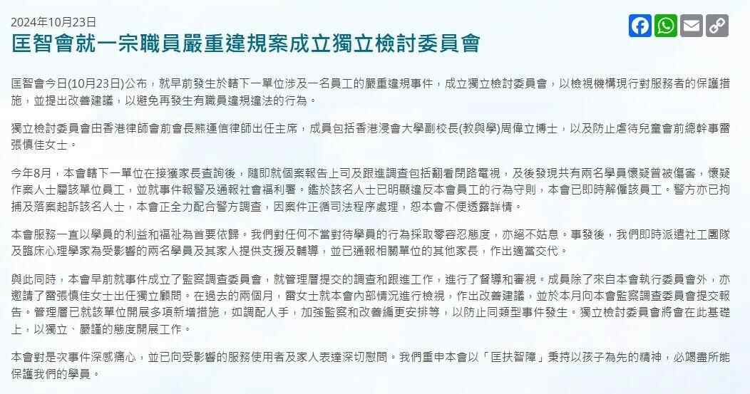 据了解,涉事男性职员已于事后被捕,被控猥亵侵犯精神上无行为能力的男性及强奸罪。匡智会10月23日公布,已解雇该职员并成立独立检讨委员会检视现行保障措施。但此事公布时距离事发已隔逾两个月。