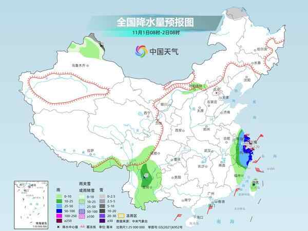 中央气象台预计,今天,黑龙江西北部、新疆北疆北部、西藏东南部等地部分地区有小雪或雨夹雪,新疆北疆北部部分地区有中到大雪。江苏南部、上海、浙江大部、四川南部、台湾岛等地部分地区有中到大雨,其中,江苏东南部、上海、浙江东北部和中南部沿海等地部分地区有暴雨或大暴雨。
