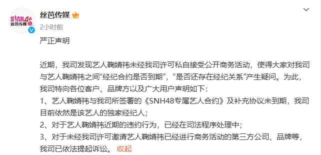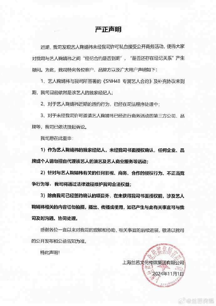 11月1日,丝芭传媒发布声明称,艺人鞠婧祎与公司所签署的《SNH48专属艺人合约》及补充协议未到期,丝芭目前依然是鞠婧祎的独家经纪人,公司发现鞠婧祎未经许可私自接受公开商务活动,对于鞠婧祎的违约行为已在司法程序处理中,并对进行商务活动的第三方公司、品牌等提起诉讼。