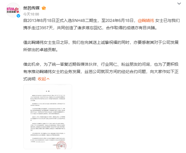 在今年的6月18日,丝芭传媒曾就与鞠婧祎的经纪合约问题发布说明。声明称:按照与鞠婧祎女士签署的《SNH48专属艺人合约》及补充合约之内容约定,双方基于SNH48女团经纪协议的第一阶段部分合作已宣告圆满完成,并将自即日起根据补充协议条款,正式过渡到以艺人经纪协议为基础的第二阶段合作之中。