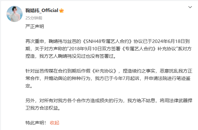 对此,鞠婧祎方也发布声明回应:鞠婧祎与丝芭的《SNH48专属艺人合约》协议已于2024年6月18日到期,所谓“补充协议”系对方捏造,鞠婧祎没见过也没有签署过,并已在7月起诉,申请法院进行笔迹鉴定。对于对合作方造成损失的行为,将用法律武器捍卫合法权益。