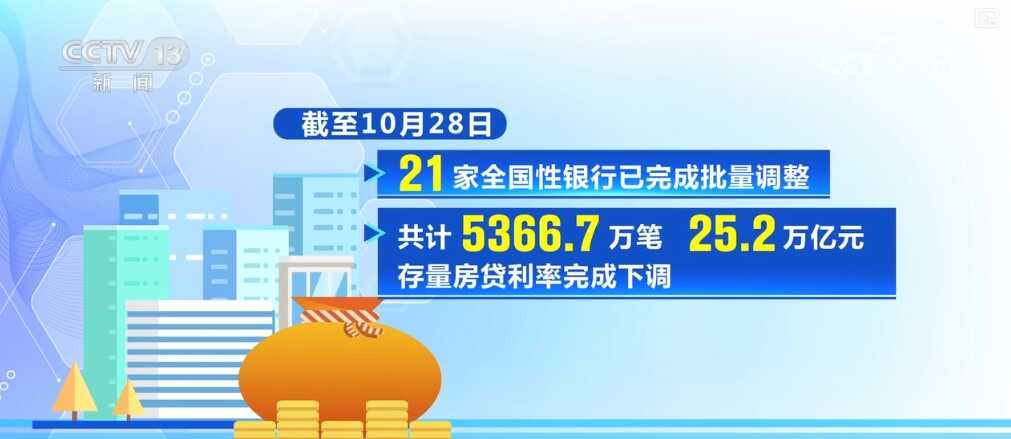 初步统计,截至10月28日,21家全国性银行已完成批量调整,共计5366.7万笔、25.2万亿元存量房贷利率完成下调。其他中小银行也于10月31日全部完成了存量房贷利率的批量调整。