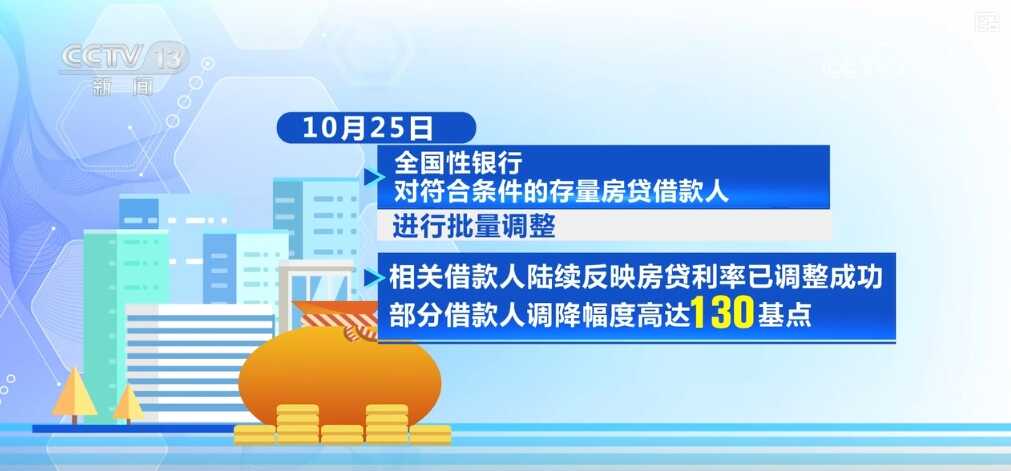 此前,10月25日,全国性银行对符合条件的存量房贷借款人进行了批量调整。相关借款人陆续反映房贷利率已调整成功,部分借款人调降幅度高达130基点。