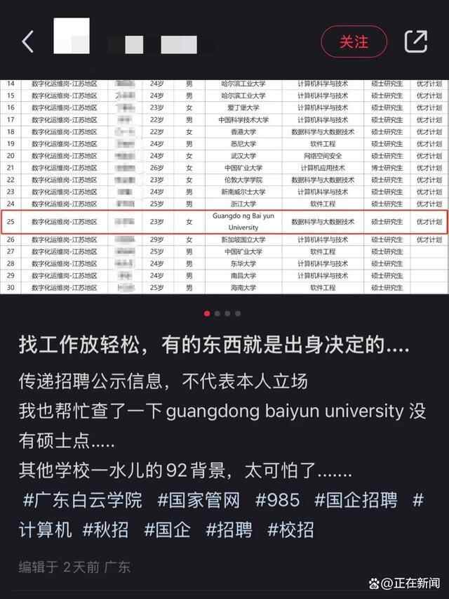 记者查询公开信息发现,广东白云学院没有硕士点,且根据国家管网集团2025年高校毕业生招聘公告,优才范围为QS排名前30名高校的研究生和国内排名前10名高校的研究生。