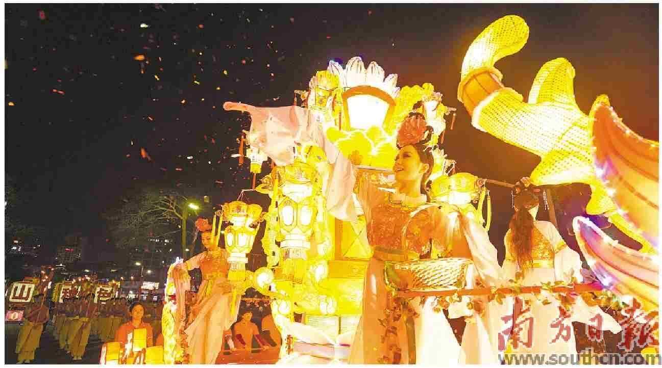 晚间,巡游队伍从祖庙牌坊广场出发,在近150分钟的巡游时间里与市民游客进行了全长3.3公里的互动。这其中,18辆主题彩车穿插在巡游队伍中,创佛山历年彩车数量之最。