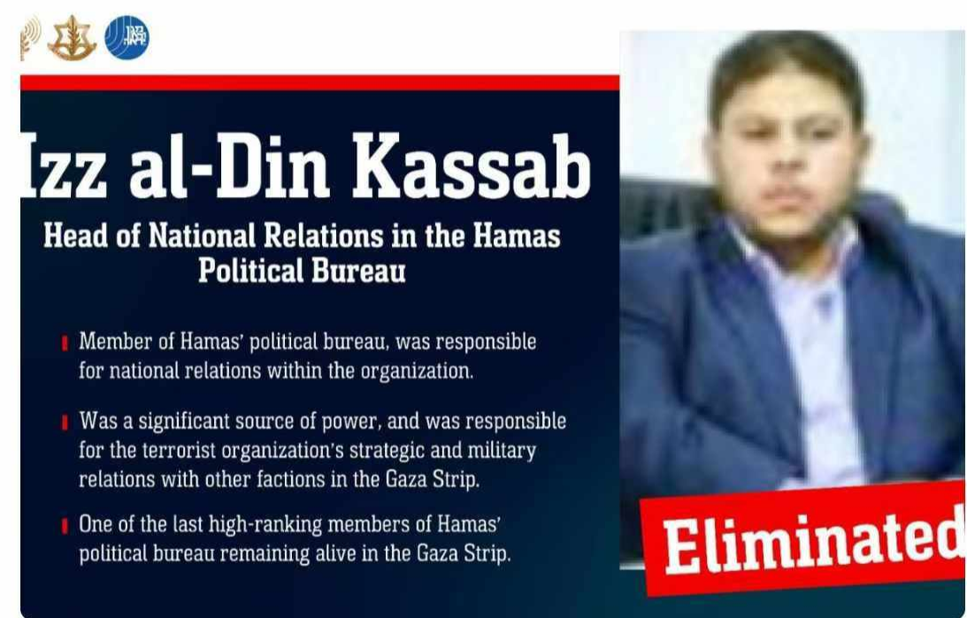 据德国新闻电视频道网站11月1日报道,以色列军方称,他们已经打死哈马斯在加沙地带仅存的高级官员之一伊兹·丁·卡萨卜(下图)。卡萨卜是哈马斯政治局成员,负责协调与加沙地带的其他极端组织的关系。