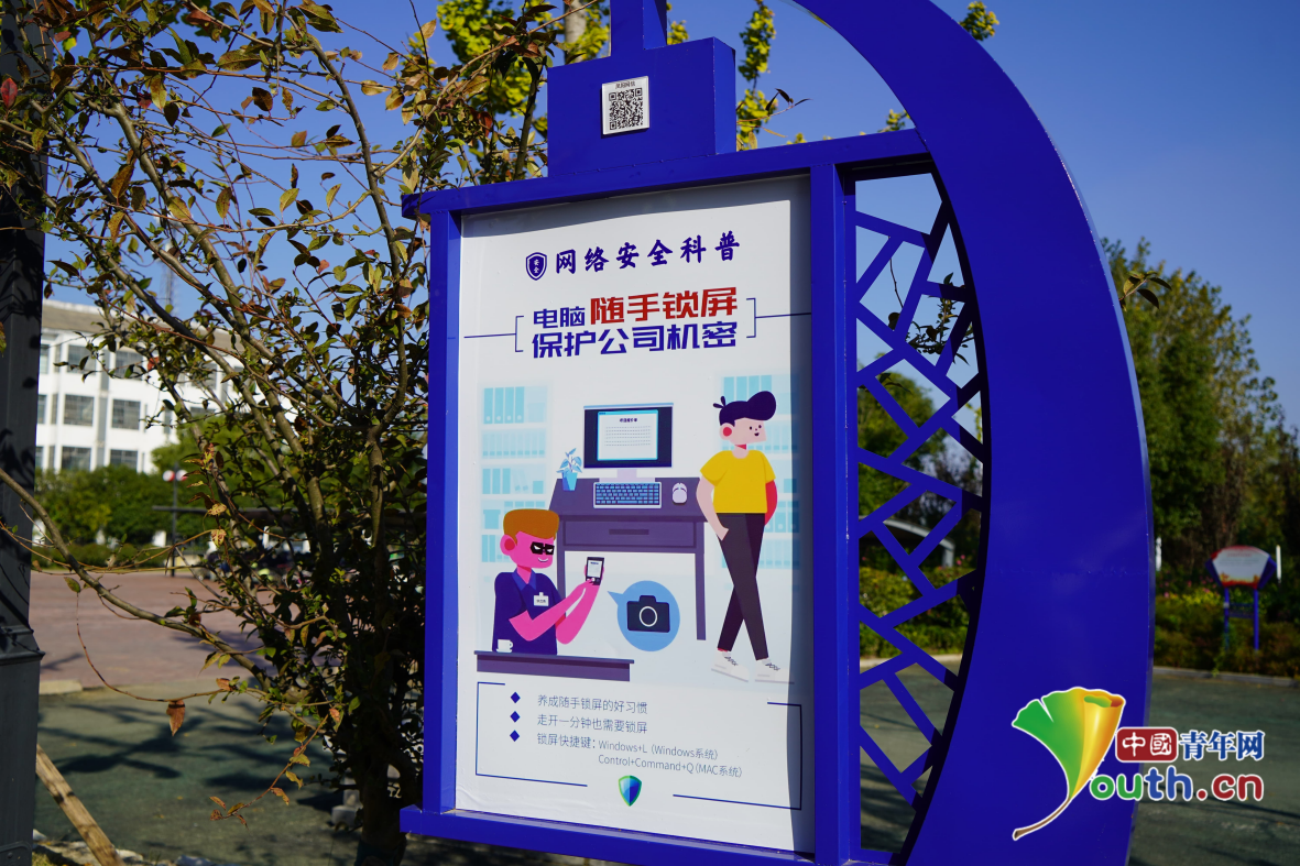 广场中的普法立牌,扫码可在线观看视频。中国青年网记者 田昕禾摄