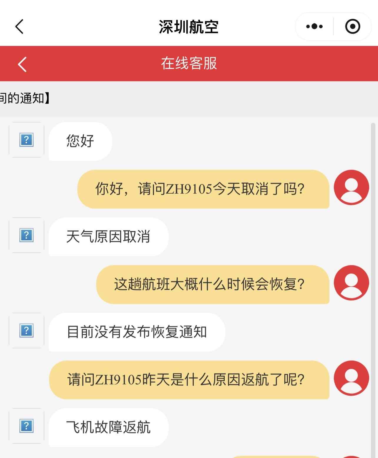 11月3日,ZH9105航班已经取消,记者就此咨询了深圳航空在线客服。客服称是“由于天气原因取消”,并且“目前没有发布恢复通知”。而昨日(2日)的返航原因,客服回应是“飞机故障返航”。