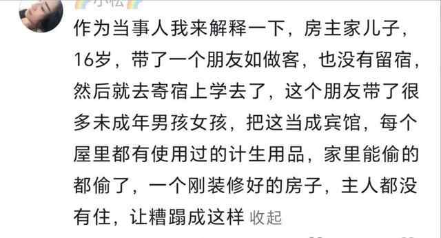 @1天真情深1:请让他们赔偿所有用过的东西价值费+精神损失费+擅闯民宅住宿费。并且坐牢!好好的自己家被恶心成这样看着好气。