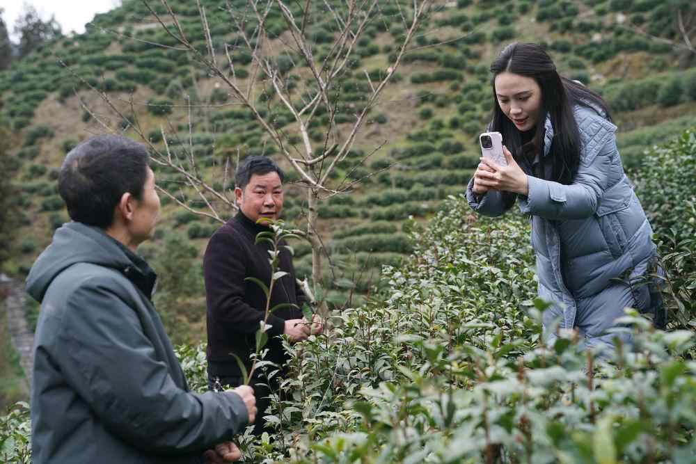 林红梅(右一)在安康市紫阳县城关镇一处茶山上拍摄记录茶园春管情况。新华社记者 邵瑞 摄