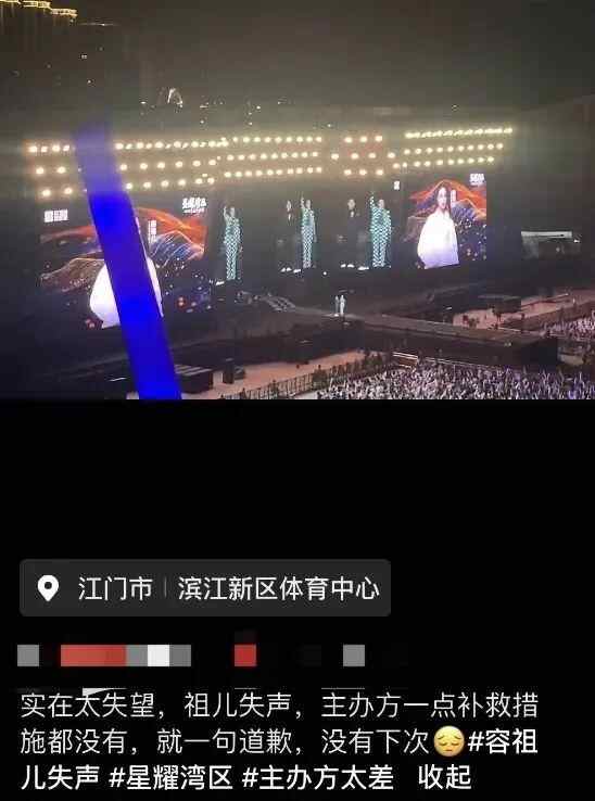 11月2日,在星耀湾区演唱会江门站,原定阵容嘉宾容祖儿因身体原因失声,未能正常演唱,向观众道歉。据悉,因演唱会主办方未提前告知,引发现场部分观众不满,有观众高喊“退票”。在社交平台,也有不少网友表示十分气愤,要求主办方退票,“明明是奔着容祖儿去的”。