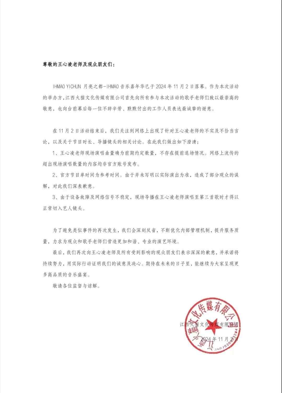 对此,主办方发布声明致歉,并表示王心凌现场演唱曲量确为前期约定数量,不存在提前退场情况,官方节目单时间为参考时间。由于并未写明以实际演出为准,造成了部分观众的误解。此外,由于设备故障及网络信号不稳定,在王心凌演唱至第三首歌时才得以正常切入艺人镜头。