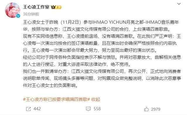 11月3日晚,王心凌工作室发声否认提前退场,并称希望主办方再次公开、正式的向消费者说明歌单传闻,现场镜头多寡等问题。